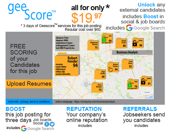 Geescore™ scores, matches & engages with Jobseekers in the “front-end” – inside a job post, a job search, career pages, fan sites and via API. Make a better, no-bias hiring decision with comprehensive jobseeker scoring.